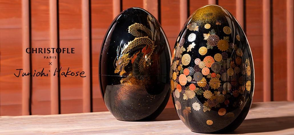 La collaboration entre la Maison Christofle et le légendaire artiste japonais Junichi Hakose nous laisse esbaubis ! Une collection extrêmement originale en émerge, dans laquelle les couverts sont enfermés, tels un précieux trésor, dans de géants œufs décorés et peints à la main par l'incroyable Junichi Hakose.