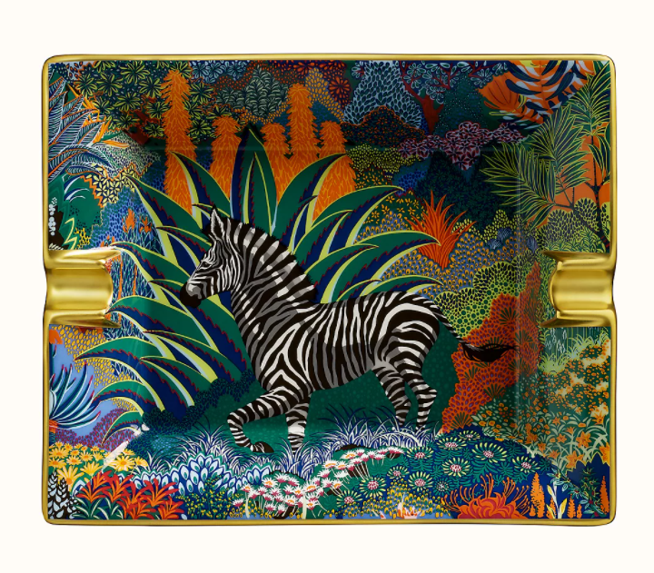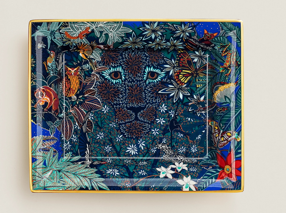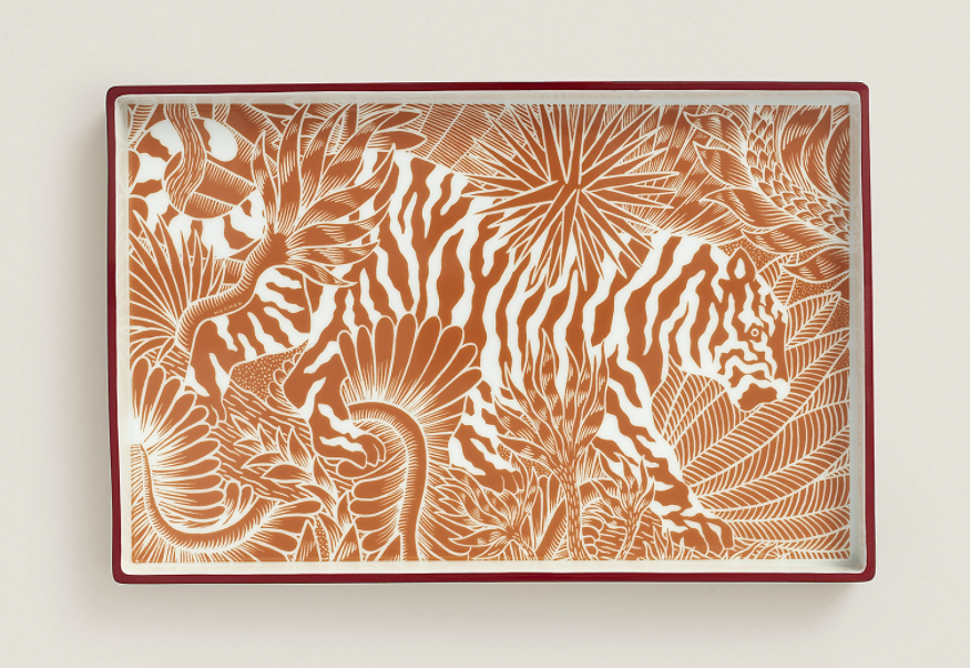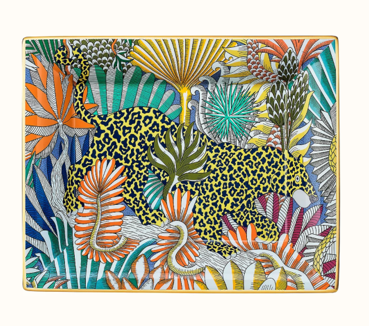 Il est aussi en porcelaine mais avec un décor appliqué par chromolithographie. Ce plateau couleur sauge, illustrant un tigre se camouflant au cœur d’une jungle monochrome coûte 620 euros.