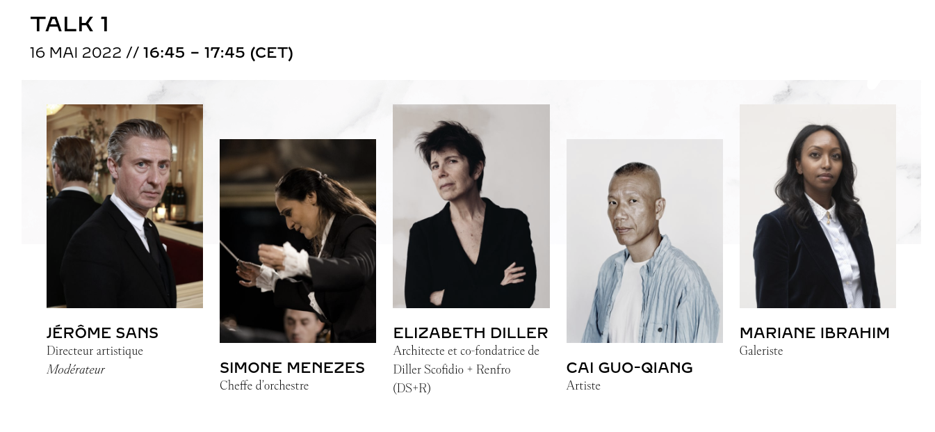 Talk 1 animé par Jérôme Sans (directeur artistique), Simone Menezes (cheffe d’orchestre), Elizabeth Diller (architecte et co-fondatrice de Diller Scofidio + Rendro ), Cai Guo-Qiang (artiste), Mariane Ibrahim (galeriste).