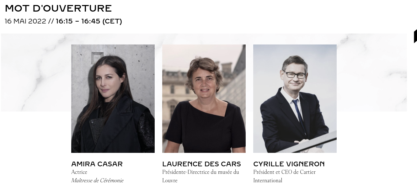 Qui de mieux pour ouvrir la conférence que Laurence des Cars, la Présidente-Directrice du musée du Louvre et Cyrille Vigneron, le Président et CEO de Cartier International ?