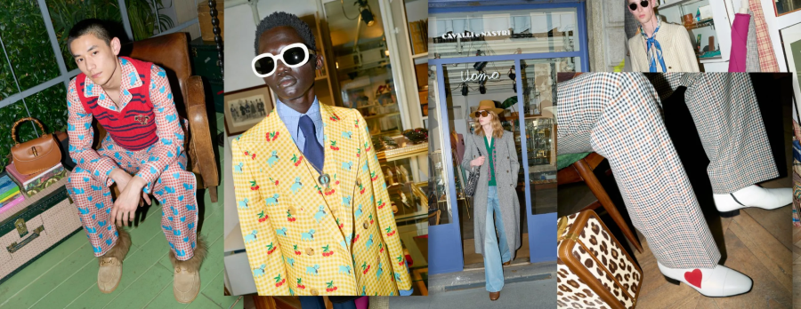 Cette collection mélange inspiration vintage et esprit grand enfant. Tous deux ont voulu remettre au goût du jour la mode british des années 70 tout en y amenant de la modernité. Pour le côté vintage, ils ont présenté des costumes en laine, des trench-coats en tweed, des pulls en maille, des pulls sans manche et plus encore. Toutes ces pièces, qui sont de base des pièces basiques de la garde-robe masculine, ont été revisitées à la façon Gucci mais surtout à la façon Harry Styles. Les couleurs, les motifs, les patches et les strass ajoutés aux vêtements donnent tout de suite ce côté extravagant qu’offre la maison Gucci ainsi que le style vestimentaire de Harry Styles. A l’heure du choix des motifs, ils ont décidé de partir sur des motifs enfantins comme des fruits, des cœurs, des animaux.