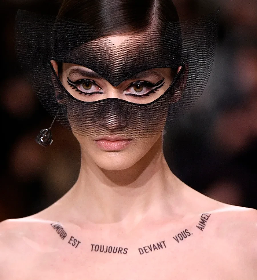 C’est au tour de la maison Dior de faire du tatouage une mise en beauté. C’est lors du défilé Haute Couture printemps-été 2018 que Maria Grazia Chiuri propose des tatouages comme bijoux sur ses mannequins. Ces tatouages prennent la forme de phrases comme: