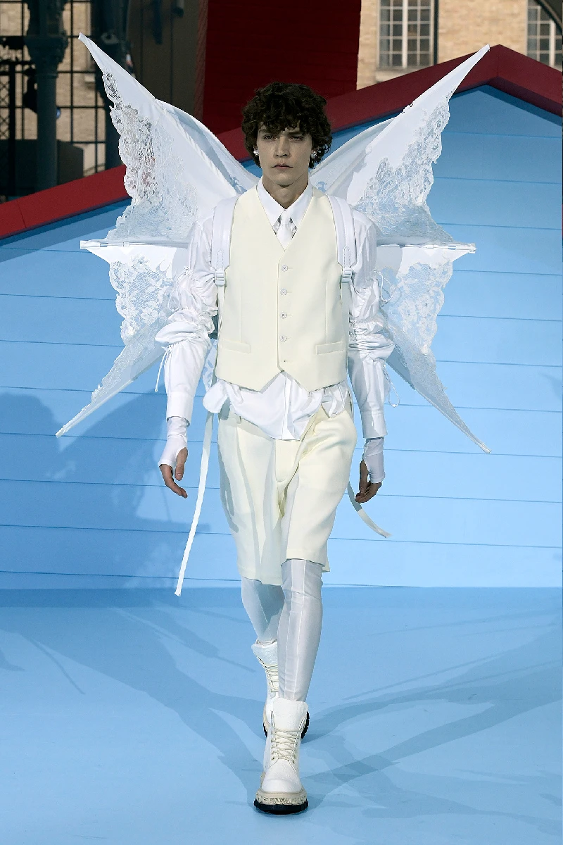 Le défilé va également se terminer sur une allusion à l'ouverture de son premier défilé en 2019, six mannequins masculins habillés en robe de mariée avec des ailes d’ange en dentelle pour conclure ce défilé. Alors que chaque mannequin se disperse dans la salle, ils laissent place aux 30 membres de l’équipe de Virgil Abloh tous vêtus de t-shirts au dégradé passant du violet au orange, couleurs rappelant un magnifique et nostalgique coucher de soleil.