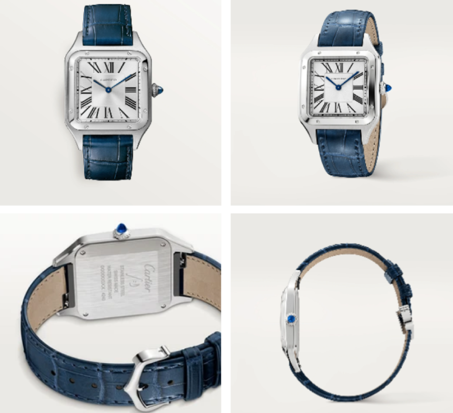 Voici la montre Santos-Dumont (4 500€), grand modèle, mouvement à quartz haute autonomie (~ 6 ans). Elle possède une boîte en acier, une couronne perlée ornée d’un spinelle de synthèse bleu en forme de cabochon, un cadran argenté satiné soleil, des chiffres romains, des aiguilles en forme de glaive en acier bleui, une glace saphir, un bracelet en alligator bleu marine et une boucle ardillon en acier.