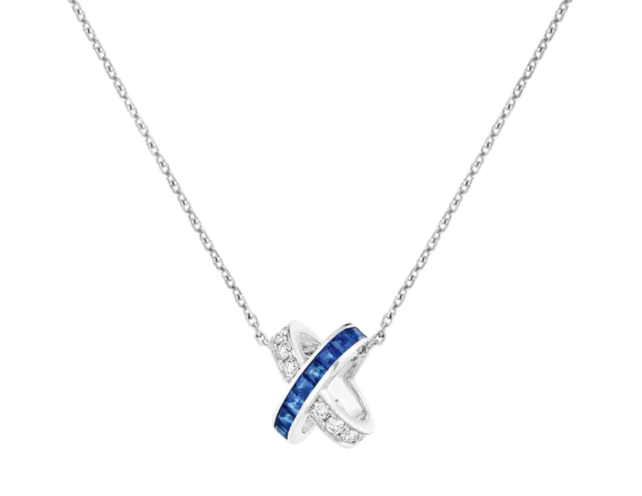 Pendentif Jeux de Liens en or blanc, serti de diamants taille brillant et de saphirs taille carré (7 650 euros).