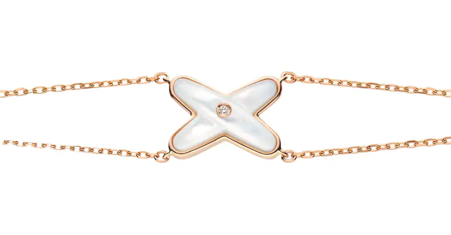 Bracelet Jeux de Liens en or rose, serti de nacre et d’un diamant taille brillant (1 590 euros)