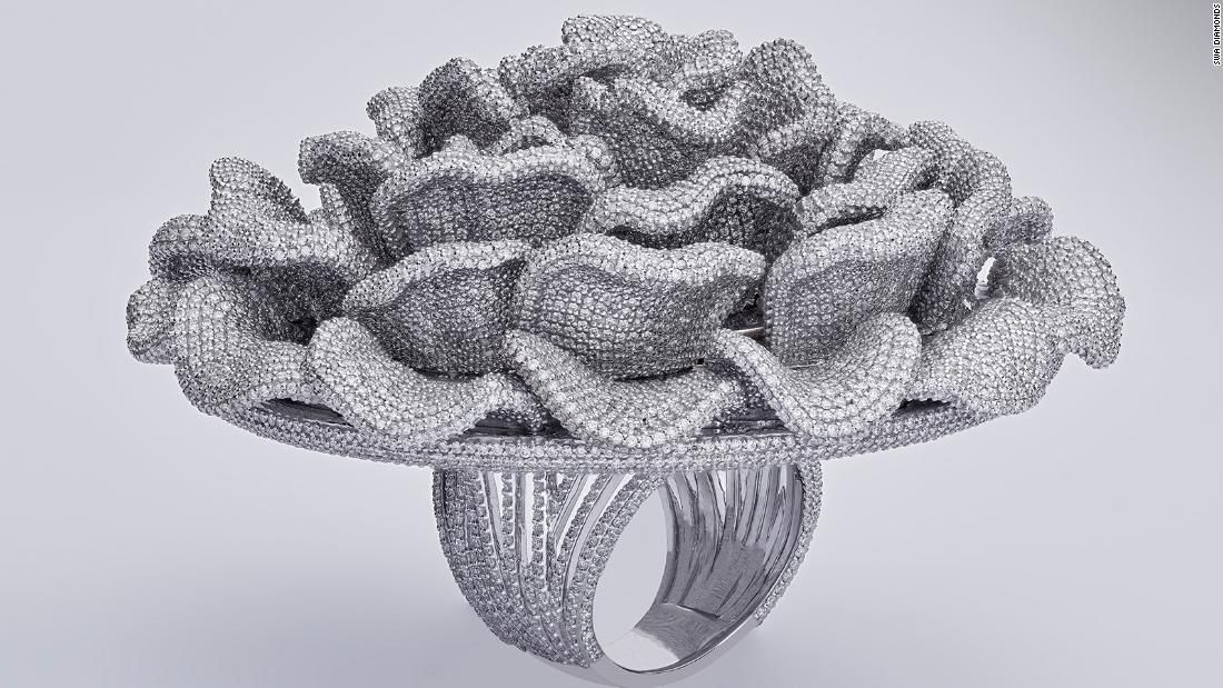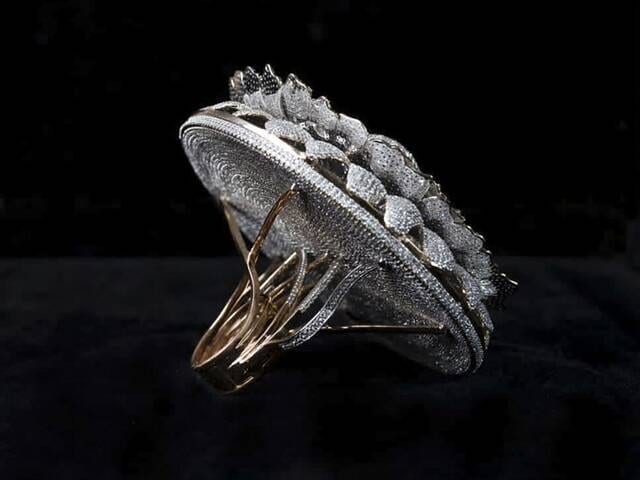 Auparavant, en 2019, Lakshikaa Jewels de Mumbai, en Inde, a créé une bague accrocheuse sur 18 mois avec 7 777 diamants sur une base de pli 18k. Elle a été évaluée à 4,9 millions de dollars américains et a été méticuleusement réalisée par une équipe de douze artisans et un bijoutier et designer expérimenté pour recréer le temple du Lotus à Delhi sur un bijou.
