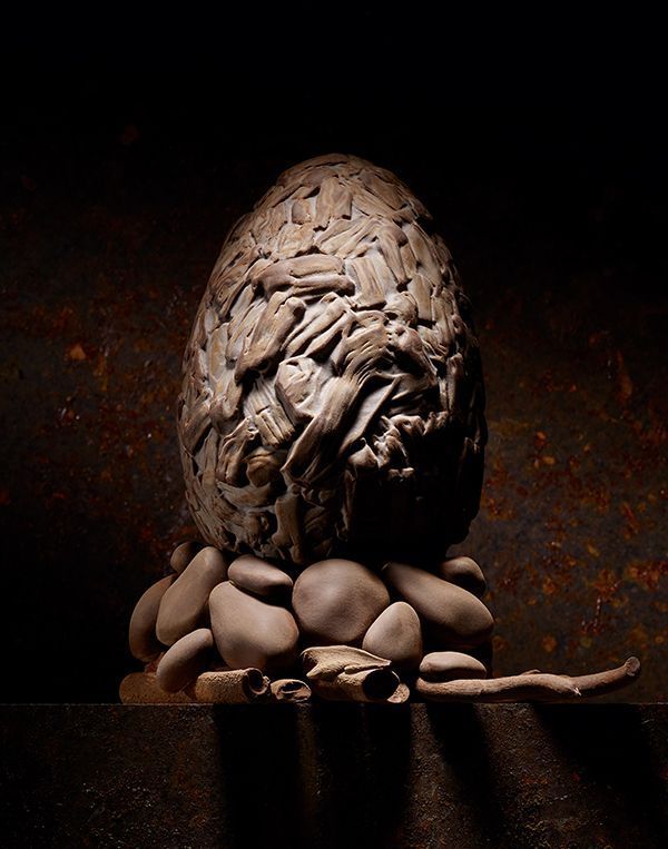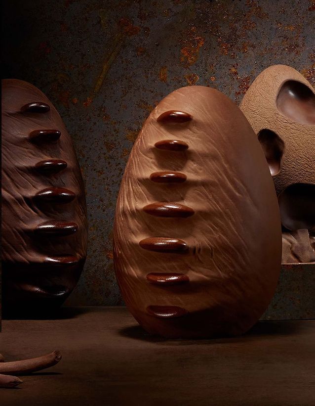 Chaque œuf a été imaginé avec une identité propre qui évoque les forces élémentaires de la nature. L’œuf Inédit, fait de chocolat noir Pure origine Équateur, s’applique à reproduire à la perfection le bois flotté sinueux, érodé par les éléments et lentement dérivé sur les plages. Une gourmandise infiniment brute et infiniment chocolat. Tandis que l’œuf Fossilis, tapissé d’un subtil manteau de feuilles et de végétaux fossilisés, se décline en noir, au lait ou blond.