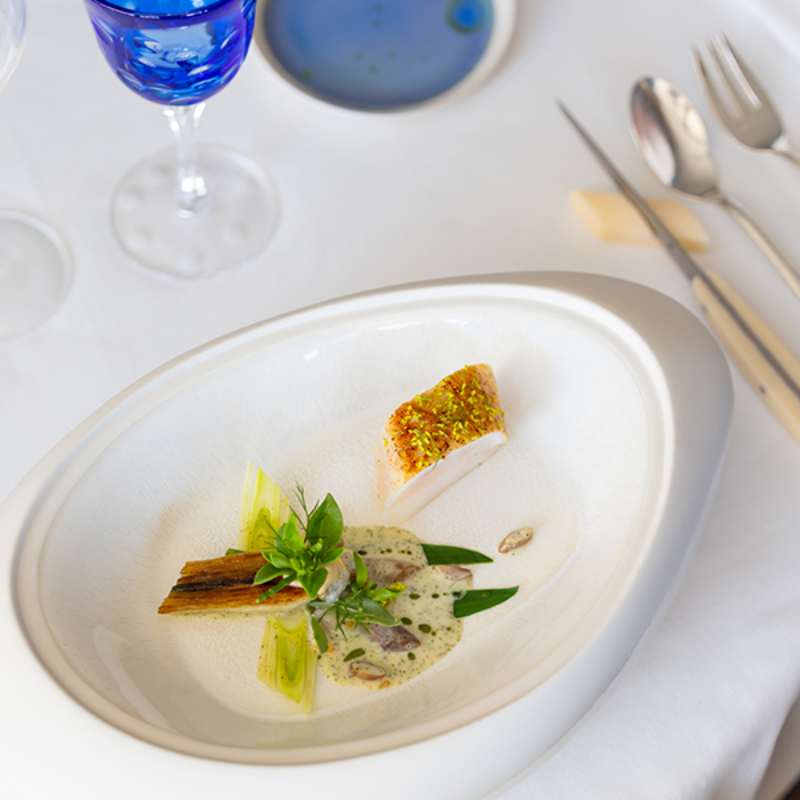 Reconnus pour leur engagement à promouvoir les terroirs d'exception, leur sens de l'innovation tout en restant fidèles à la tradition, le duo a créé un plat signature, entre balance et harmonie, à associer à Dom Ruinart Blanc de Blancs 2010 : saint-pierre rôti dans une meunière de six anisés, jeunes fenouils rôtis au plancton marin, coquillages du moment et herbes sauvages des embruns marins.
