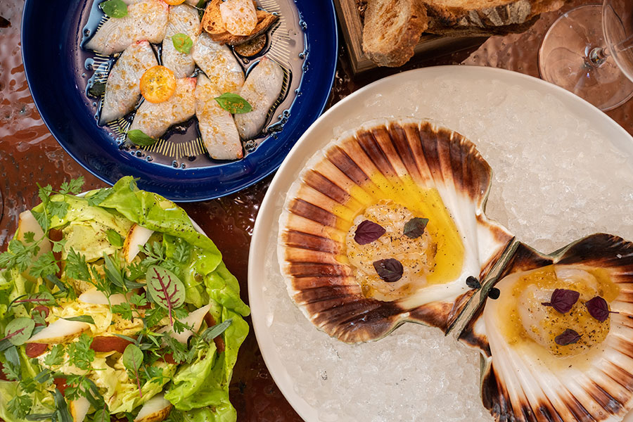 Dans l’assiette, on nous promet de la spontanéité autour du poisson, qu’il soit marin ou d’eau douce, dans tous ses états, cru, mariné, grillé, poêlé ou vapeur. Et pour nous mettre l’eau à la bouche, ces Saint-Jacques du jour qui s’habilleront d’un simple filet d’huile d’olive et d’une pincée de poivre parfumé.