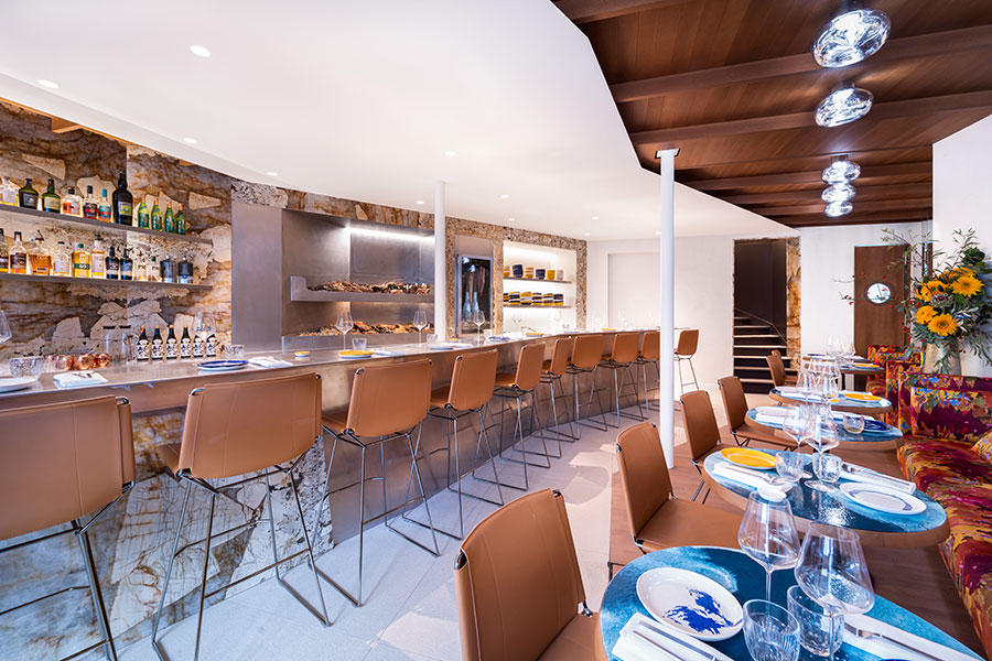 A l’étage, des salles ultra cosy aux tons chaleureux, bois de chêne, longues banquettes en velours mordoré, déclinaisons de safran et de curcuma. Tandis que les cuisines ouvertes se dévoilent sans complexe. D’un côté, le Chef David Le Quellec et son équipe, de l’autre, le Chef pâtissier Pierre Chirac qui déclinera les grands classiques sucrés côtiers tels le Paris Brest, l’Afogato ou les fruits givrés.