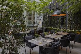 Au cœur de l’hôtel, se cache une agréable terrasse ombragée qui propose une parenthèse hors du temps où l’on se prélasse à l’abri des regards. Entre érables japonais, fougères rafraichissantes et mobilier aux coloris naturels et chaleureux, le patio invite à la détente loin du tumulte de la capitale et devient le lieu idéal pour une pause savoureuse.