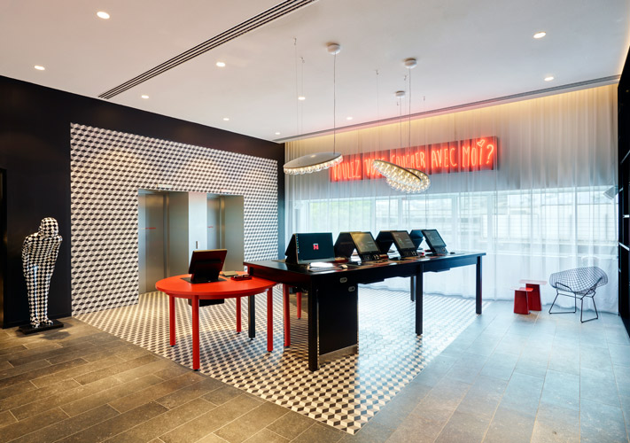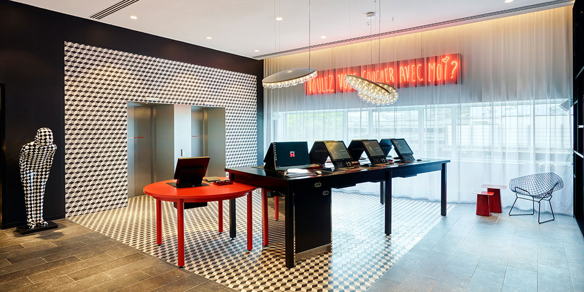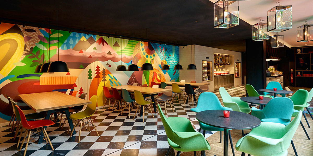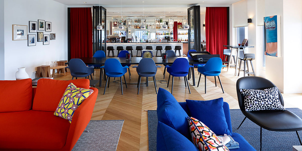 En fil rouge de ces hôtels d’un nouveau genre, la signature artistique propre à chaque lieu. A Paris, cette ancienne tour de bureaux des années 70 a été relookée par le studio  de design Concrete, basé aux Pays Bas. L’ambiance du lobby, lumineuse et colorée a été imaginée par les artistes néerlandais Martin & Visser et l’artiste de rue et illustrateur français Mast Cora a reçu carte blanche pour réaliser une imposante fresque murale. Le mobilier sélectionné chez Vitra, compte des pièces iconiques signées par de grands noms du design comme Prouvé ou Charles Eames. A la fois cosy et design, le lobby conserve les grands standards de la convivialité comme la cheminée, les tapis confortables, le bois au sol et un patio baigné de lumière naturelle.