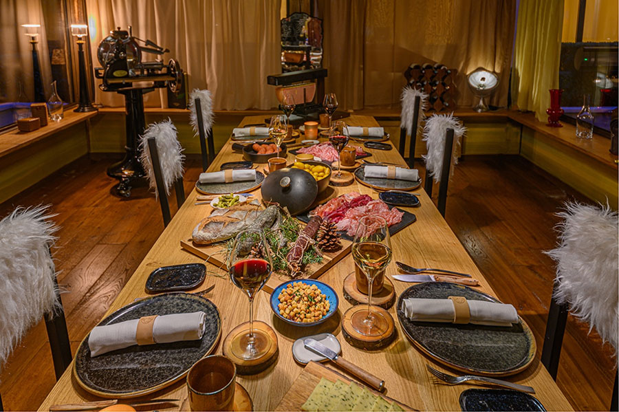 A l’intérieur, lustre vertigineux fabriqué à la main, belle table en chêne, chaises confortables agrémentées de douillettes peaux de mouton, tout concourt à rendre le moment mémorable et chalereux à l’entrée de l’hiver.